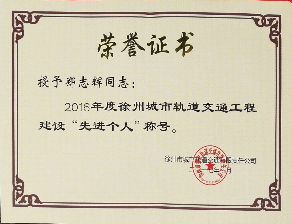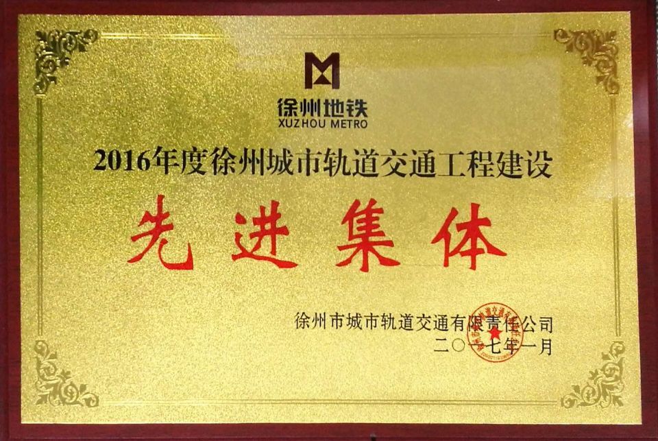 二O一七年一月,我公司榮獲徐州市城市軌道交通有限責任公司頒發(fā)的“2016年度徐州城市軌道交通工程建設先進集體獎”;同時,我公司員工鄭志輝獲得“2016年度徐州城市軌道交通工程建設先進個人稱號”。
