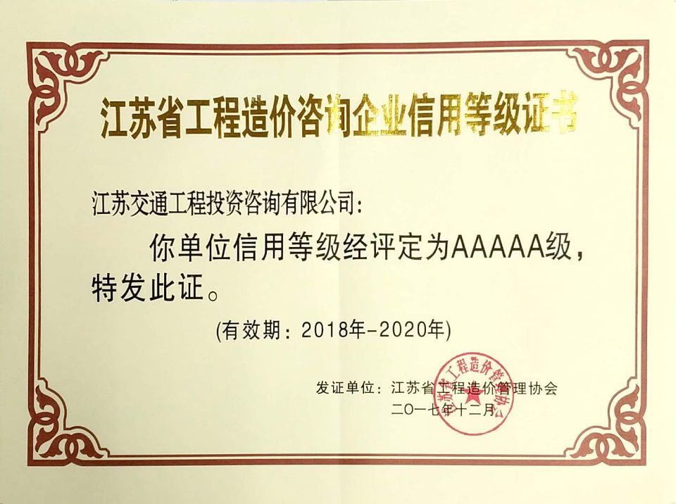 近期,我公司評為江蘇省工程造價企業(yè)信用等級AAAAA級(有效期2018-2020年)。