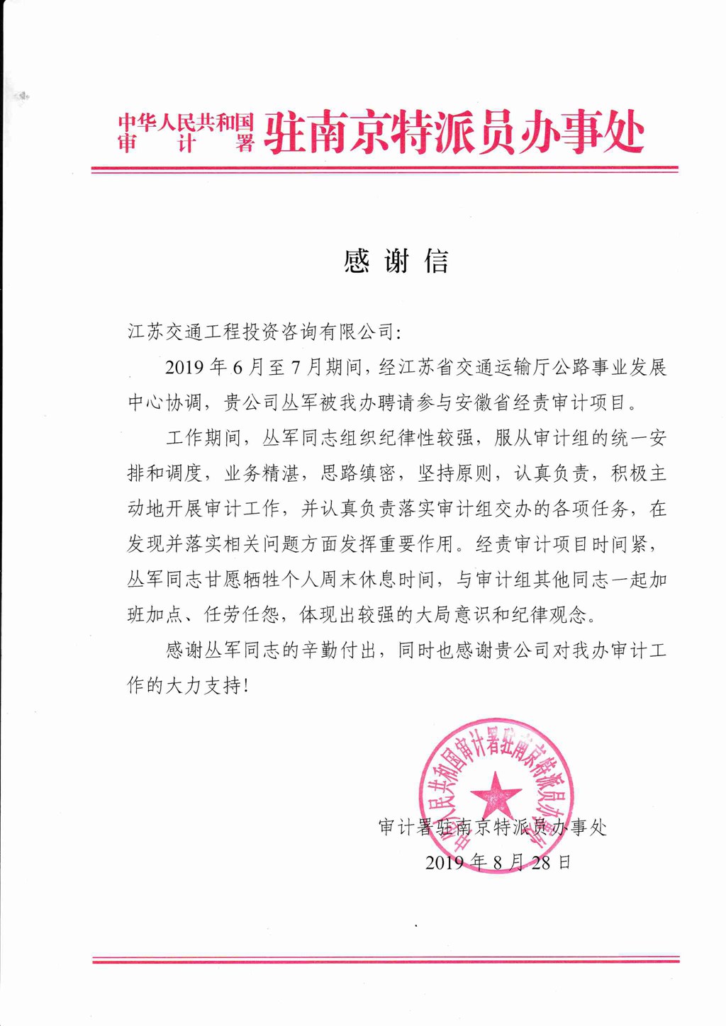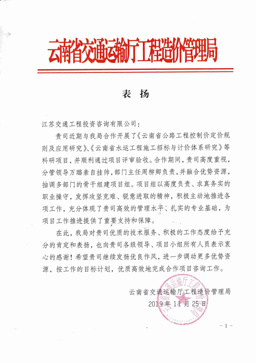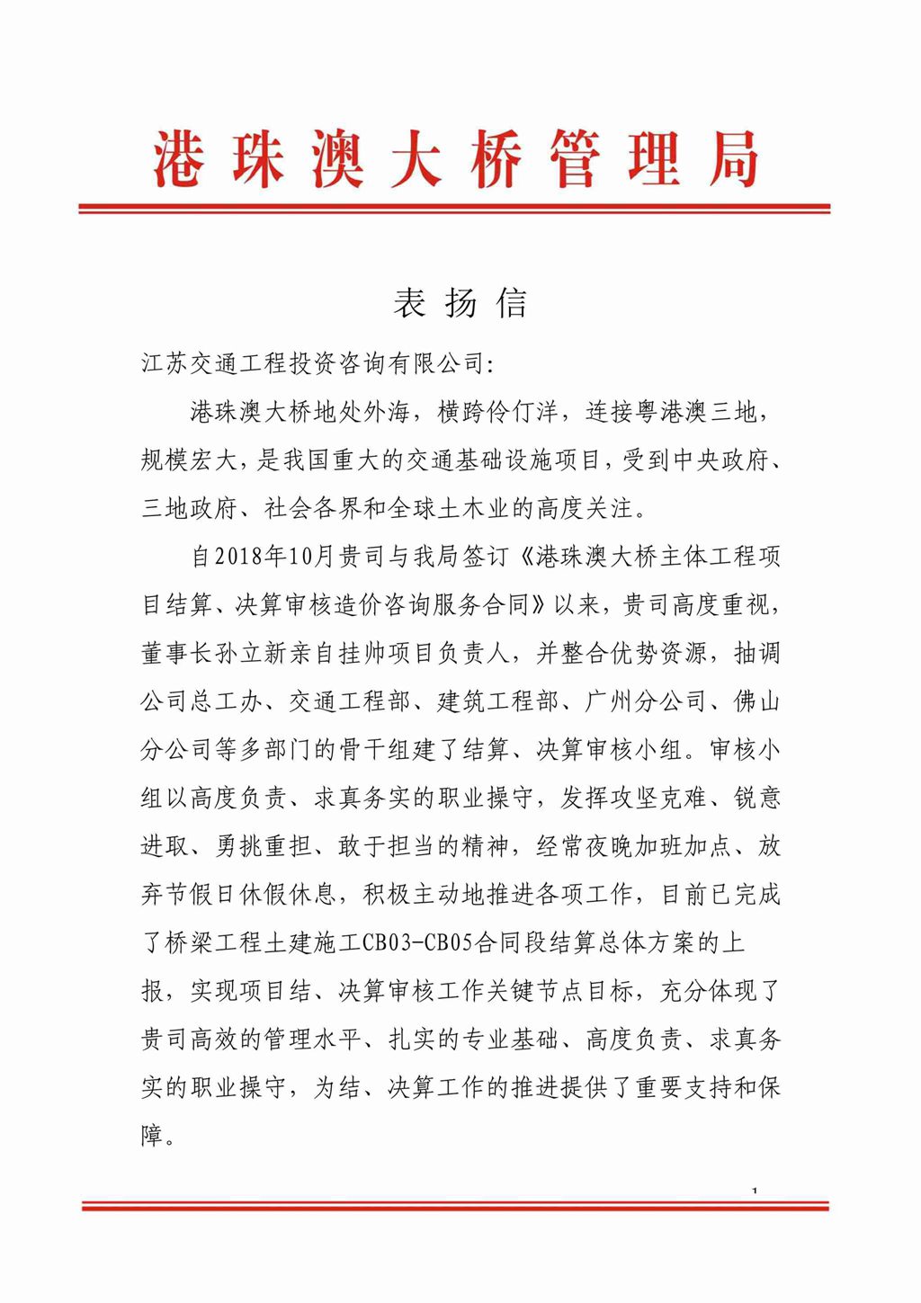 近期,在公司領(lǐng)導(dǎo)的帶領(lǐng)及業(yè)務(wù)部門的辛勤努力下,我公司榮獲“中華人民共和國審計(jì)署駐南京特派員辦事處”、“港珠澳大橋管理局”、“云南省交通運(yùn)輸廳工程造價(jià)管理局”等業(yè)主單位簽發(fā)的表彰,對(duì)我公司目前承接或已完成的咨詢工作表示了充分的肯定和表揚(yáng)。