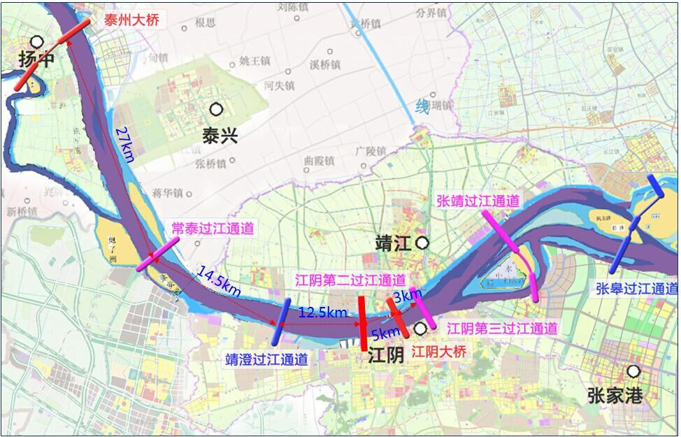張皋過江通道位于江陰大橋下游28公里、蘇通大橋上游57公里。根據(jù)目前工可研究,擬采用雙向八車道(接線段六車道)高速公路標(biāo)準(zhǔn)設(shè)計(jì)。線位起自張家港晨陽鎮(zhèn)東側(cè)疏港高速,向北于張皋汽渡上游進(jìn)入長江,上跨瀏海沙水道,經(jīng)靖江馬洲島,跨越如皋中汊福姜沙北水道,于如皋華泰重工廠區(qū)登陸,向西北方向延伸,終點(diǎn)接滬陜高速,路線全長約28km。