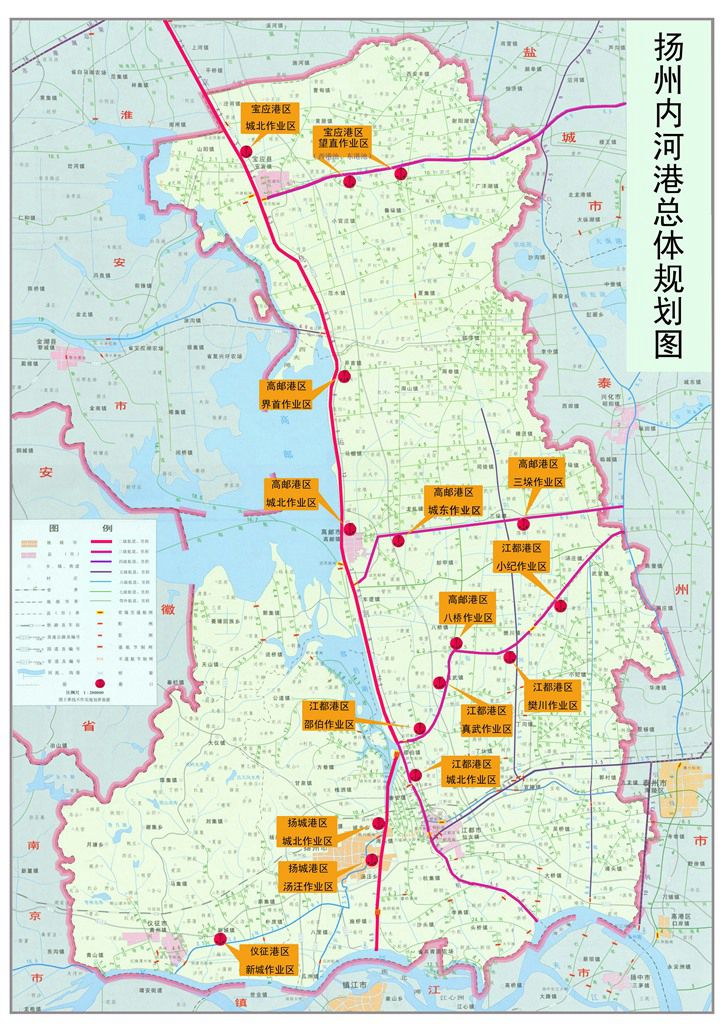 揚(yáng)州內(nèi)河港是江蘇省地區(qū)性重要港口,是揚(yáng)州市綜合交通運(yùn)輸體系的重要樞紐!兑(guī)劃》共規(guī)劃揚(yáng)州內(nèi)河港口岸線18093米,明確揚(yáng)州內(nèi)河港由揚(yáng)城港區(qū)、寶應(yīng)港區(qū)、高郵港區(qū)、江都港區(qū)和儀征港區(qū)構(gòu)成“一港五區(qū)”總體發(fā)展格局。