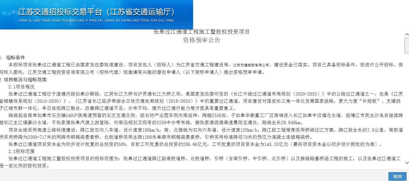 張皋過江通道工程施工暨股權(quán)投資項(xiàng)目資格預(yù)審